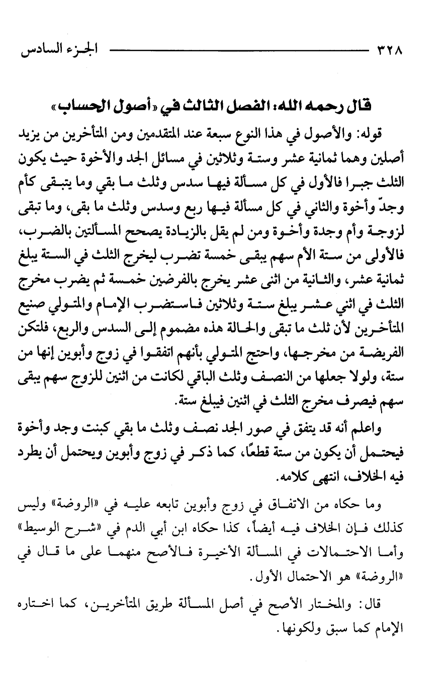 قوله: والأصول في هذا النوع سبعة عند المتقدمين ومن المتأخرين من يزيد أصلين وهما ثمانية عشر وستة وثلاثين في مسائل الجد والأخوة حيث يكون الثلث جبرا فالأول في كل مسألة فيها سدس وثلث ما بقي وما يتبقى كأم وجدّ وأخوة والثاني في كل مسألة فيها ربع وسدس وثلث ما بقي، وما تبقى لزوجة وأم وجدة وأخوة ومن لم يقل بالزيادة يصحح المسألتين بالضرب، فالأولى من ستة الأم سهم يبقى خمسة تضرب ليخرج الثلث في الستة يبلغ ثمانية عشر، والثانية من اثنى عشر يخرج بالفرضين خمسة ثم يضرب مخرج الثلث في اثني عشر يبلغ ستة وثلاثين فاستضرب الإمام والمتولي صنيع المتأخرين لأن ثلث ما تبقى والحالة هذه مضموم إلى السدس والربع، فلتكن الفريضة من مخرجها، واحتج المتولي بأنهم اتفقوا في زوج وأبوين إنها من ستة، ولولا جعلها من النصف وثلث الباقي لكانت من اثنين للزوج سهم يبقى سهم فيصرف مخرج الثلث في اثنين فيبلغ ستة.