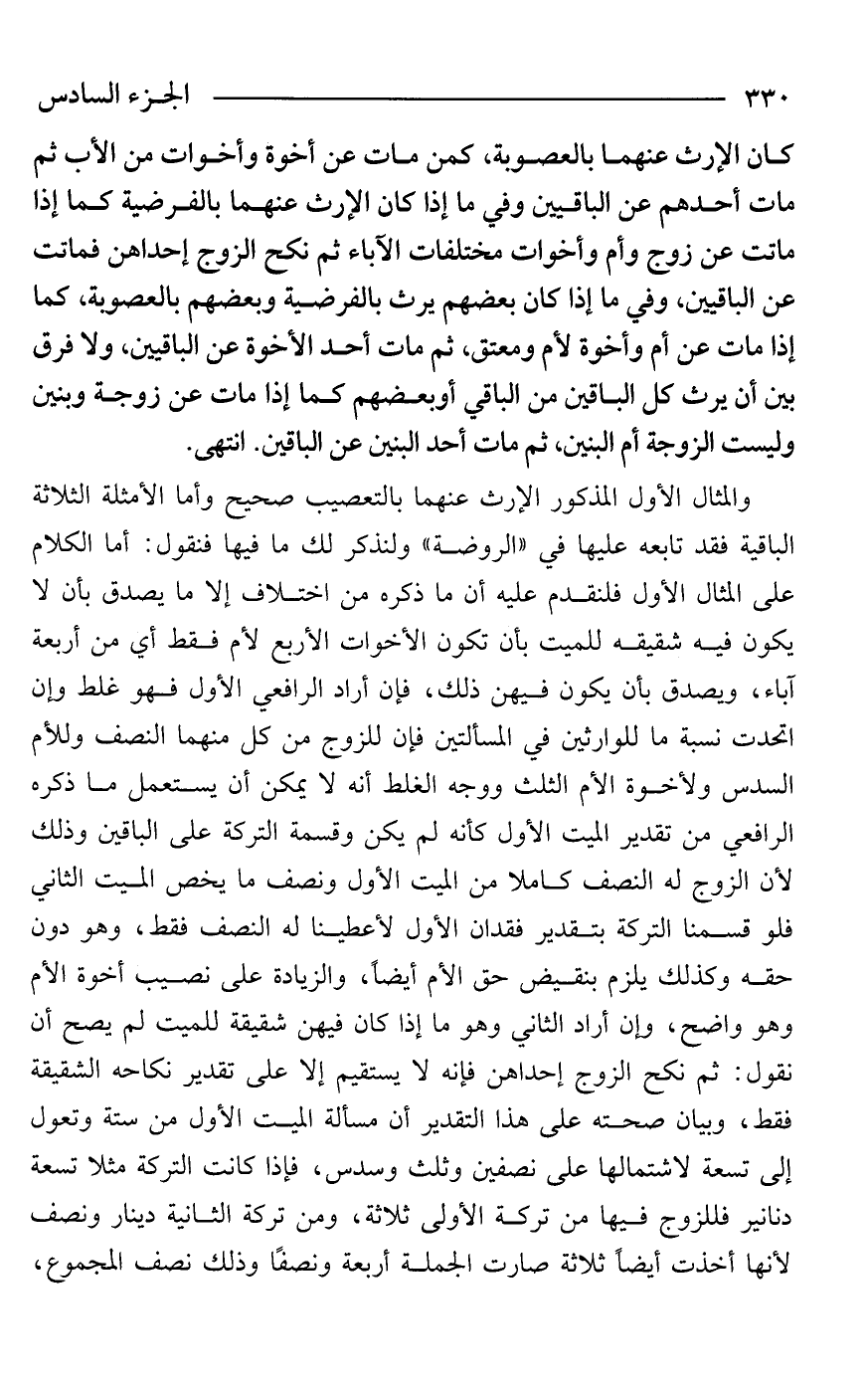 والمثال الأول المذكور الإرث عنهما بالتعصيب صحيح وأما الأمثلة الثلاثة الباقية فقد تابعه عليها في "الروضة" ولنذكر لك ما فيها فنقول: أما الكلام على المثال الأول فلنقدم عليه أن ما ذكره من اختلاف إلا ما يصدق بأن لا يكون فيه شقيقه للميت بأن تكون الأخوات الأربع لأم فقط أي من أربعة آباء، ويصدق بأن يكون فيهن ذلك، فإن أراد الرافعي الأول فهو غلط وإن اتحدت نسبة ما للوارثين في المسألتين فإن للزوج من كل منهما النصف وللأم السدس ولأخوة الأم الثلث ووجه الغلط أنه لا يمكن أن يستعمل ما ذكره الرافعي من تقدير الميت الأول كأنه لم يكن وقسمة التركة على الباقين وذلك لأن الزوج له النصف كاملًا من الميت الأول ونصف ما يخص الميت الثاني فلو قسمنا التركة بتقدير فقدان الأول لأعطينا له النصف فقط، وهو دون حقه وكذلك يلزم بنقيض حق الأم أيضًا، والزيادة على نصيب أخوة الأم وهو واضح، وإن أراد الثاني وهو ما إذا كان فيهن شقيقة للميت لم يصح أن نقول: ثم نكح الزوج إحداهن فإنه لا يستقيم إلا على تقدير نكاحه الشقيقة فقط، وبيان صحته على هذا التقدير أن مسألة الميت الأول من ستة وتعول إلى تسعة لاشتمالها على نصفين وثلث وسدس، فإذا كانت التركة مثلًا تسعة دنانير فللزوج فيها من تركة الأولى ثلاثة، ومن تركة الثانية دينار ونصف لأنها أخذت أيضًا ثلاثة صارت الجملة أربعة ونصفًا وذلك نصف المجموع،