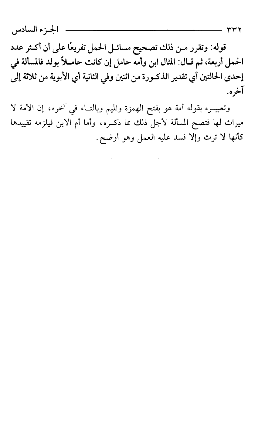 قوله: وتقرر من ذلك تصحيح مسائل الحمل تفريعًا على أن أكثر عدد الحمل أربعة ثم قال: المثال ابن وأمه حامل إن كانت حاملًا بولد فالمسألة في إحدى الحالتين أي تقدير الذكورة من اثنين وفي الثانية أي الأبوية من ثلاثة إلى آخره.