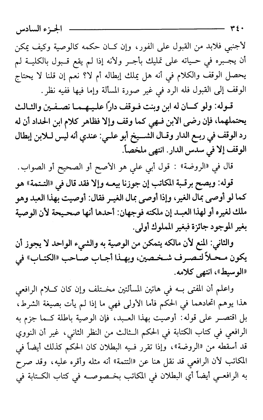 واعلم أن المفتى به في هاتين المسألتين مختلف وإن كان كلام الرافعي هذا يوهم اتحادهما في الحكم فأما الأولى فهي ما إذا لم يأت بصيغة الشرط، بل اقتصر على قوله: أوصيت بهذا العبد، فإن الوصية باطلة كما جزم به الرافعي في كتاب الكتابة في الحكم الثالث من النظر الثاني، غير أن النووي قد أسقطه من "الروضة"، وإذا تقرر فيه البطلان كان الحكم كذلك أيضًا في المكاتب لأن الرافعي قد نقل هنا عن "التتمة" أنه مثله وأقره عليه، وقد صرح به الرافعي أيضًا أي البطلان في المكاتب بخصوصه في كتاب الكتابة في