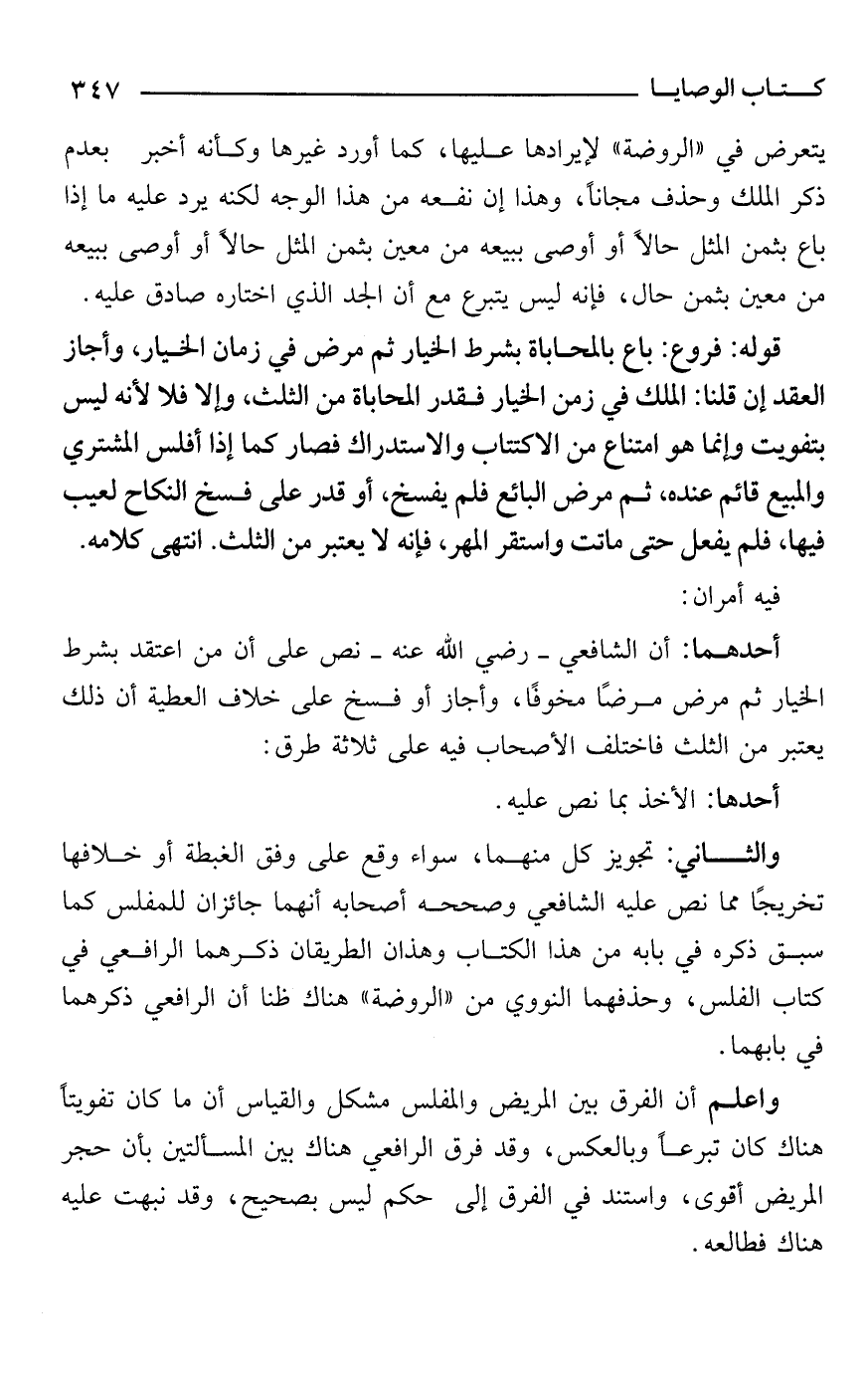 قوله: فروع: باع بالمحاباة بشرط الخيار ثم مرض في زمان الخيار، وأجاز العقد إن قلنا: الملك في زمن الخيار فقدر المحاباة من الثلث، وإلا فلا لأنه ليس بتفويت وإنما هو امتناع من الاكتتاب والاستدراك فصار كما إذا أفلس المشتري والمبيع قائم عنده، ثم مرض البائع فلم يفسخ، أو قدر على فسخ النكاح لعيب فيها، فلم يفعل حتى ماتت واستقر المهر، فإنه لا يعتبر من الثلث. انتهى كلامه.