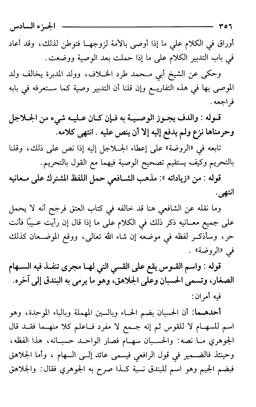 أحدهما: أن الحسبان بضم الحاء وبالسين المهملة وبالباء الموحدة، وهو اسم للسهام لا للقوس ثم إنه جمع لا مفرد فاعلم كلا منهما فقد قال الجوهري ما نصه: والحسبان سهام فصار الواحد حسبانه، هذا لفظه، وحينئذ فالضمير في قول الرافعي فيسمى عائد إلى السهام، وأما الجلاهق فبضم الجيم وهو اسم للبندق نسبة كذا صرح به الجوهري فقال: والجلاهق