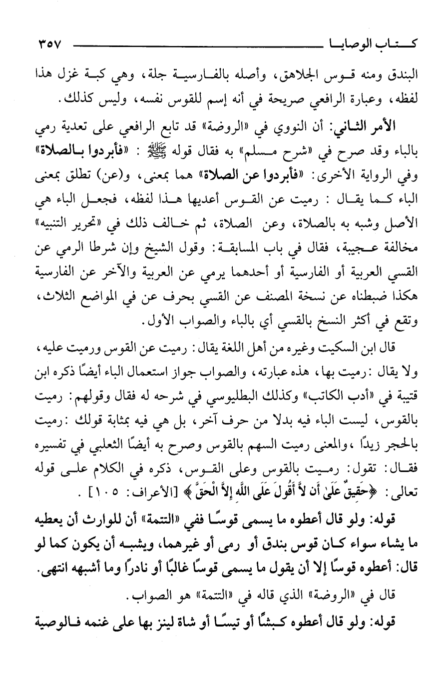 الأمر الثاني: أن النووي في "الروضة" قد تابع الرافعي على تعدية رمي بالباء وقد صرح في "شرح مسلم" به فقال قوله - صَلَّى اللَّهُ عَلَيْهِ وَسَلَّمَ -: "فأبردوا بالصلاة" وفي الرواية الأخرى: "فأبردوا عن الصلاة" هما بمعنى، و (عن) تطلق بمعنى الباء كما يقال: رميت عن القوس أعديها هذا لفظه، فجعل الباء هي الأصل وشبه به بالصلاة، وعن الصلاة، ثم خالف ذلك في "تحرير التنبيه" مخالفة عجيبة، فقال في باب المسابقة: وقول الشيخ وإن شرطا الرمي عن القسي العربية أو الفارسية أو أحدهما يرمي عن العربية والآخر عن الفارسية هكذا ضبطناه عن نسخة المصنف عن القسي بحرف عن في المواضع الثلاث، وتقع في أكثر النسخ بالقسي أي بالباء والصواب الأول.