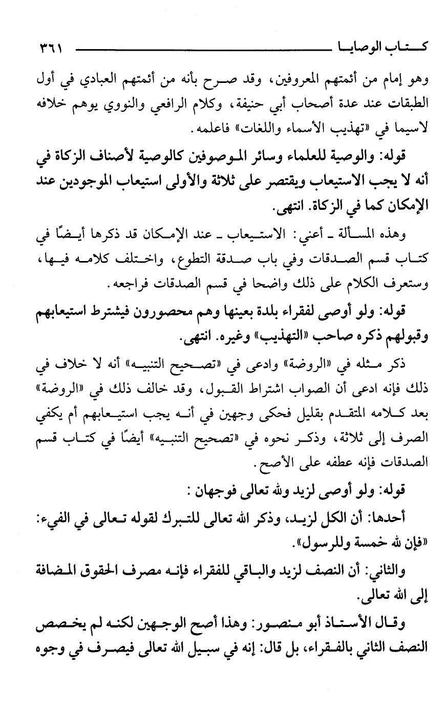 قوله: والوصية للعلماء وسائر الموصوفين كالوصية لأصناف الزكاة في أنه لا يجب الاستيعاب ويقتصر على ثلاثة والأولى استيعاب الموجودين عند الإمكان كما في الزكاة. انتهى.