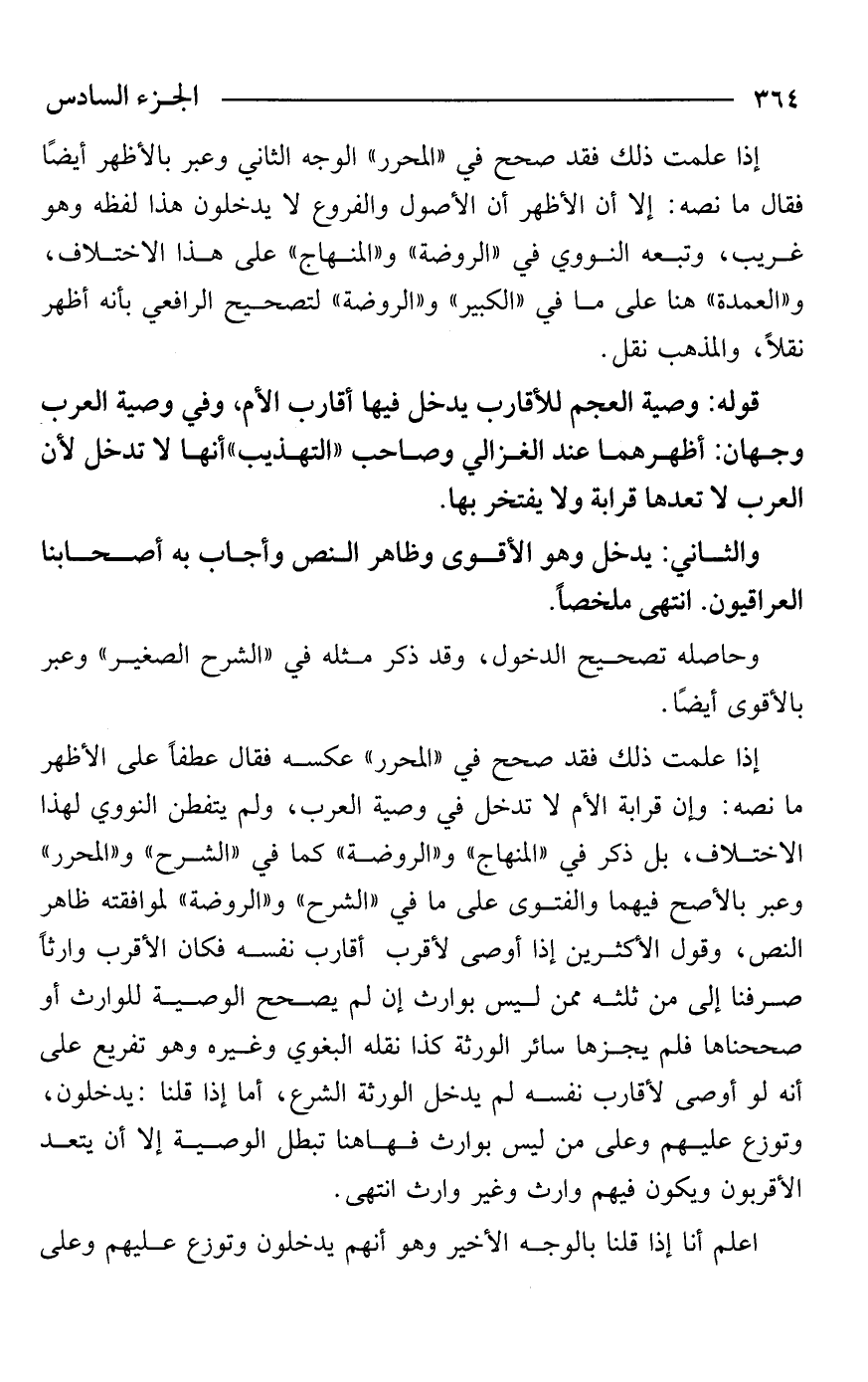 إذا علمت ذلك فقد صحح في "المحرر" عكسه فقال عطفًا على الأظهر ما نصه: وإن قرابة الأم لا تدخل في وصية العرب، ولم يتفطن النووي لهذا الاختلاف، بل ذكر في "المنهاج" و"الروضة" كما في "الشرح" و"المحرر" وعبر بالأصح فيهما والفتوى على ما في "الشرح" و"الروضة" لموافقته ظاهر النص، وقول الأكثرين إذا أوصى لأقرب أقارب نفسه فكان الأقرب وارثًا صرفنا إلى من ثلثه ممن ليس بوارث إن لم يصحح الوصية للوارث أو صححناها فلم يجزها سائر الورثة كذا نقله البغوي وغيره وهو تفريع على أنه لو أوصى لأقارب نفسه لم يدخل الورثة الشرع، أما إذا قلنا: يدخلون، وتوزع عليهم وعلى من ليس بوارث فهاهنا تبطل الوصية إلا أن يتعد الأقربون ويكون فيهم وارث وغير وارث انتهى.