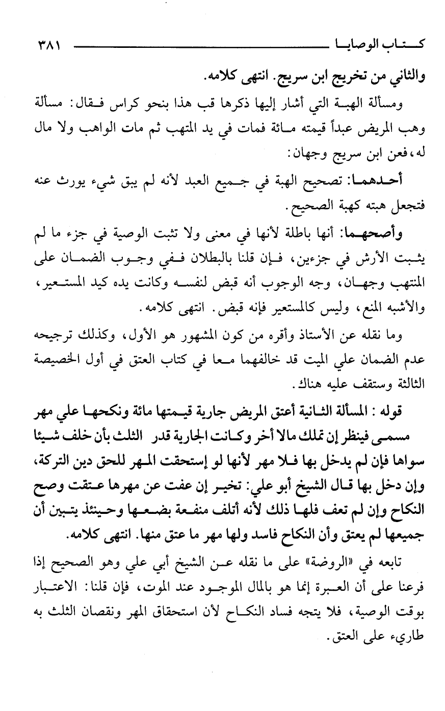 ومسألة الهبة التي أشار إليها ذكرها قبل هذا بنحو كراس فقال: مسألة وهب المريض عبدًا قيمته مائة فمات في يد المتهب ثم مات الواهب ولا مال له، فعن ابن سريج وجهان: