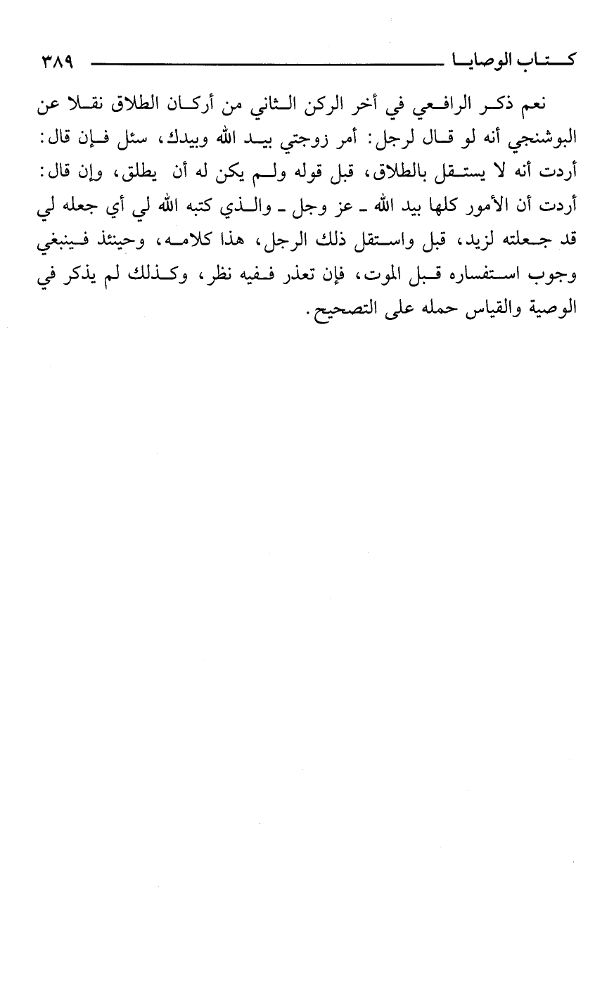 نعم ذكر الرافعي في أخر الركن الثاني من أركان الطلاق نقلا عن البوشنجي أنه لو قال لرجل: أمر زوجتي بيد الله وبيدك، سئل فإن قال: أردت أنه لا يستقل بالطلاق، قبل قوله ولم يكن له أن يطلق، وإن قال: أردت أن الأمور كلها بيد الله -عز وجل- والذي كتبه الله لي أي جعله لي قد جعلته لزيد، قبل واستقل ذلك الرجل، هذا كلامه، وحينئذ فينبغي وجوب استفساره قبل الموت، فإن تعذر ففيه نظر، وكذلك لم يذكر في الوصية والقياس حمله على التصحيح.