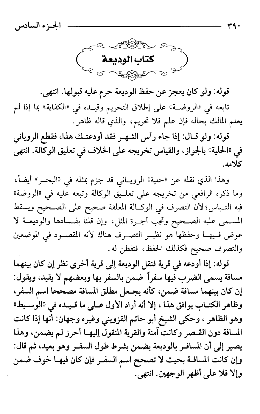 وهذا الذي نقله عن "حلية" الروياني قد جزم بمثله في "البحر" أيضًا، وما ذكره الرافعي من تخريجه علي تعليق الوكالة وتبعه عليه في "الروضة" فيه التباس؛ لأن التصرف في الوكالة المعلقة صحيح على الصحيح ويسقط المسمى عليه الصحيح وتجب أجرة المثل، وإن قلنا بفسادها والوديعة لا عوض فيها وحفظها هو نظير التصرف هناك لأنه المقصود في الموضعين والتصرف صحيح فكذلك الحفظ، فتفطن له.