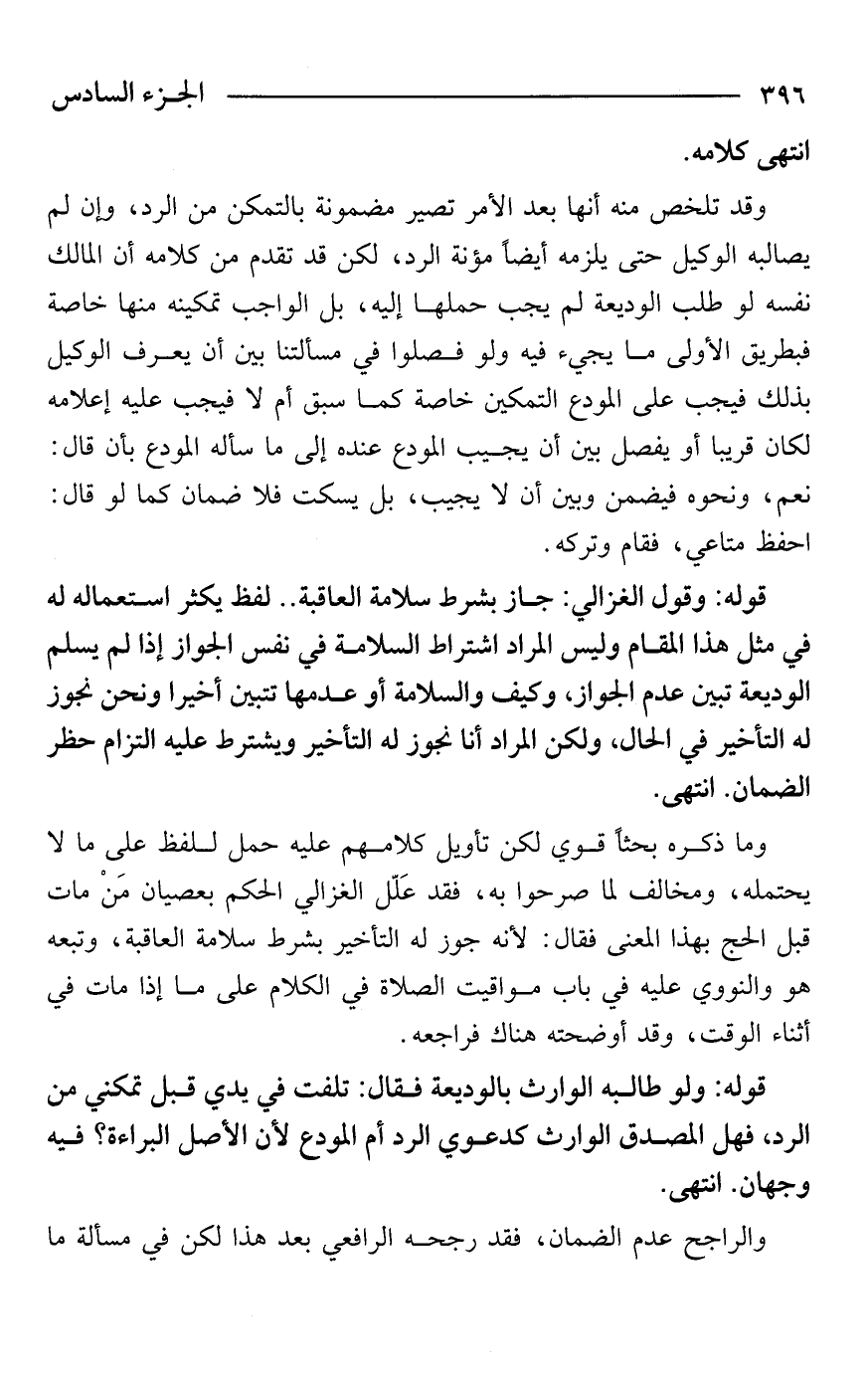 قوله: وقول الغزالي: جاز بشرط سلامة العاقبة. . لفظ يكثر استعماله له في مثل هذا المقام وليس المراد اشتراط السلامة في نفس الجواز إذا لم يسلم الوديعة تبين عدم الجواز، وكيف والسلامة أو عدمها تتبين أخيرًا ونحن نجوز له التأخير في الحال، ولكن المراد أنا نجوز له التأخير ويشترط عليه التزام حظر الضمان. انتهى.