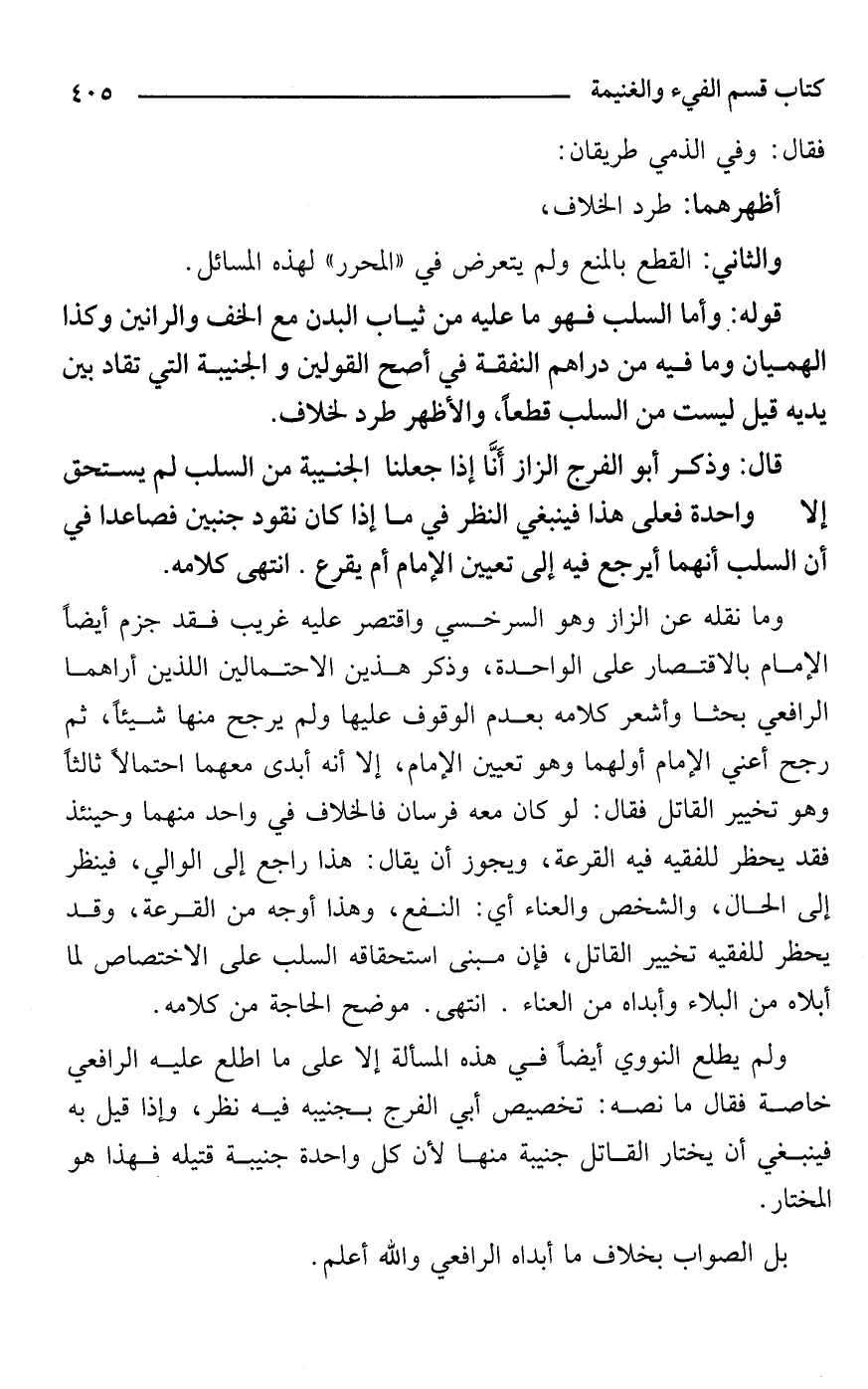 قال: وذكر أبو الفرج الزاز أَنَّا إذا جعلنا الجنيبة من السلب لم يستحق إلا واحدة فعلى هذا فينبغي النظر في ما إذا كان نقود جنبين فصاعدا في أن السلب أنهما أيرجع فيه إلى تعيين الإمام أم يقرع. انتهى كلامه.