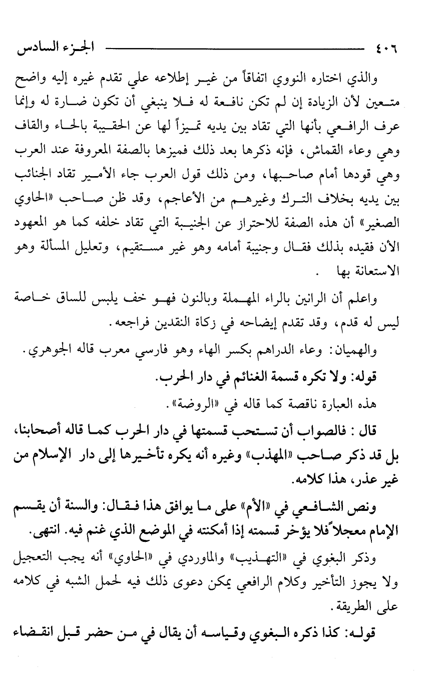 والذي اختاره النووي اتفاقًا من غير إطلاعه علي تقدم غيره إليه واضح متعين لأن الزيادة إن لم تكن نافعة له فلا ينبغي أن تكون ضارة له وإنما عرف الرافعي بأنها التي تقاد بين يديه تميزًا لها عن الحقيبة بالحاء والقاف وهي وعاء القماش، فإنه ذكرها بعد ذلك فميزها بالصفة المعروفة عند العرب وهي قودها أمام صاحبها، ومن ذلك قول العرب جاء الأمير تقاد الجنائب بين يديه بخلاف الترك وغيرهم من الأعاجم، وقد ظن صاحب "الحاوي الصغير" أن هذه الصفة للاحتراز عن الجنيبة التي تقاد خلفه كما هو المعهود الآن فقيده بذلك فقال وجنيبة أمامه وهو غير مستقيم، وتعليل المسألة وهو الاستعانة بها.