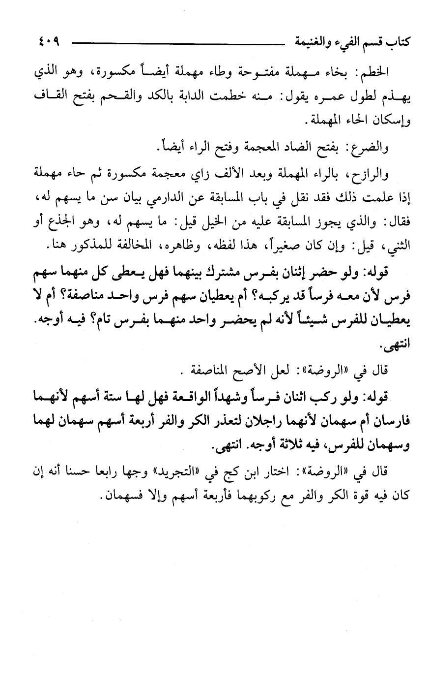 قوله: ولو حضر إثنان بفرس مشترك بينهما فهل يعطى كل منهما سهم فرس لأن معه فرسًا قد يركبه؟ أم يعطيان سهم فرس واحد مناصفة؟ أم لا يعطيان للفرس شيئًا لأنه لم يحضر واحد منهما بفرس تام؟ فيه أوجه. انتهى.