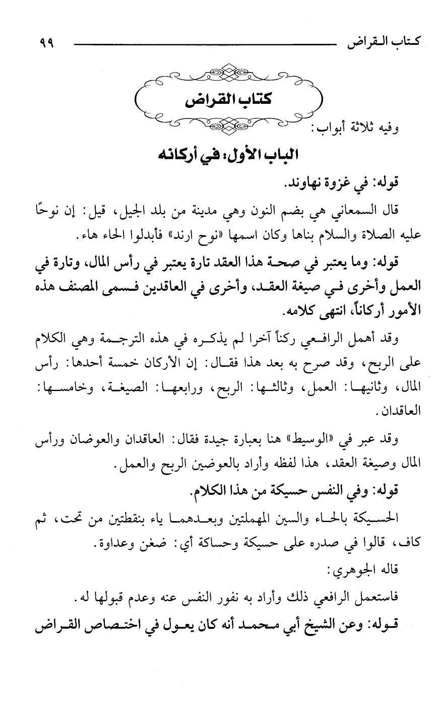 وقد عبر في "الوسيط" هنا بعبارة جيدة فقال: العاقدان والعوضان ورأس المال وصيغة العقد، هذا لفظه وأراد بالعوضين الربح والعمل.