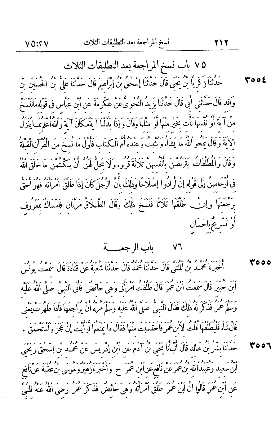3556 - حَدَّثَنَا بِشْرُ بْنُ خَالِدٍ، قَالَ: أَنْبَأَنَا يَحْيَى بْنُ آدَمَ، عَنْ ابْنِ إِدْرِيسَ، عَنْ مُحَمَّدِ بْنِ إِسْحَاقَ، وَيَحْيَى بْنُ سَعِيدٍ، وَعُبَيْدُ اللَّهِ بْنُ عُمَرَ، عَنْ نَافِعٍ، عَنْ ابْنِ عُمَرَ، ح وأَخْبَرَنَا زُهَيْرٌ، عَنْ مُوسَى بْنِ عُقْبَةَ، عَنْ نَافِعٍ، عَنْ ابْنِ عُمَرَ، قَالُوا: إِنَّ ابْنَ عُمَرَ طَلَّقَ امْرَأَتَهُ وَهِيَ حَائِضٌ، فَذَكَرَ عُمَرُ رَضِيَ اللَّهُ عَنْهُ لِلنَّبِيِّ صَلَّى اللهُ عَلَيْهِ وَسَلَّمَ، فَقَالَ: «§مُرْهُ فَلْيُرَاجِعْهَا حَتَّى تَحِيضَ حَيْضَةً أُخْرَى، فَإِذَا طَهُرَتْ فَإِنْ شَاءَ طَلَّقَهَا، وَإِنْ شَاءَ أَمْسَكَهَا، فَإِنَّهُ الطَّلَاقُ الَّذِي أَمَرَ اللَّهُ عَزَّ وَجَلَّ بِهِ» قَالَ تَعَالَى: {فَطَلِّقُوهُنَّ لِعِدَّتِهِنَّ} [الطلاق: 1]