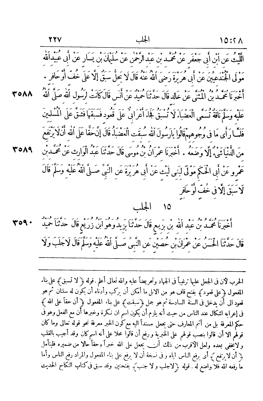 الْحَرْب لِأَن فِي الْجعل عَلَيْهَا ترغيبا فِي الْجِهَاد وتحريضا عَلَيْهِ وَالله تَعَالَى أعلم قَوْله لَا تسبق على بِنَاء الْمَفْعُول على قعُود بِفَتْح قَاف هُوَ من الْإِبِل مَا أمكن أَن يركب وَأَدْنَاهُ أَن يكون لَهُ سنتَانِ ثمَّ هُوَ قعُود إِلَى أَن يدْخل فِي السّنة السَّادِسَة ثمَّ هُوَ جمل سبقت على بِنَاء الْمَفْعُول أَن حَقًا على الله فِي إعرابه اشكال عِنْد النَّاس من حَيْثُ أَنه يلْزم أَن يكون اسْم أَن نكرَة وخبرها أَن مَعَ الْفِعْل وَهُوَ فِي حكم الْمعرفَة بل من أتم المعارف حَتَّى يَجْعَل مُسْندًا إِلَيْهِ مَعَ كَون الْخَبَر معرفَة نَحْو قَوْله تَعَالَى وَمَا كَانَ قَوْلهم الا أَن قَالُوا بِنصب قَوْلهم على الخبرية وَرفع أَن قَالُوا محلا على أَنه اسْم كَانَ وَقد أُجِيب بِالْقَلْبِ وَلَا يخفى بعده وَلَعَلَّ الْأَقْرَب من ذَلِك أَن يَجْعَل على الله خَبرا وَحقا حَالا من ضَمِيره فَلْيتَأَمَّل أَن لَا يرْتَفع أَي بِرَفْع النَّاس إِيَّاه وَفِي نُسْخَة أَن لَا يرفع على بِنَاء الْمَفْعُول وَالْمرَاد رفع النَّاس وَأما مَا رَفعه الله فَلَا وَاضع لَهُ قَوْله لَا جلب وَلَا جنب بِفتْحَتَيْنِ وَقد سبق فِي كتاب النِّكَاح الحَدِيث