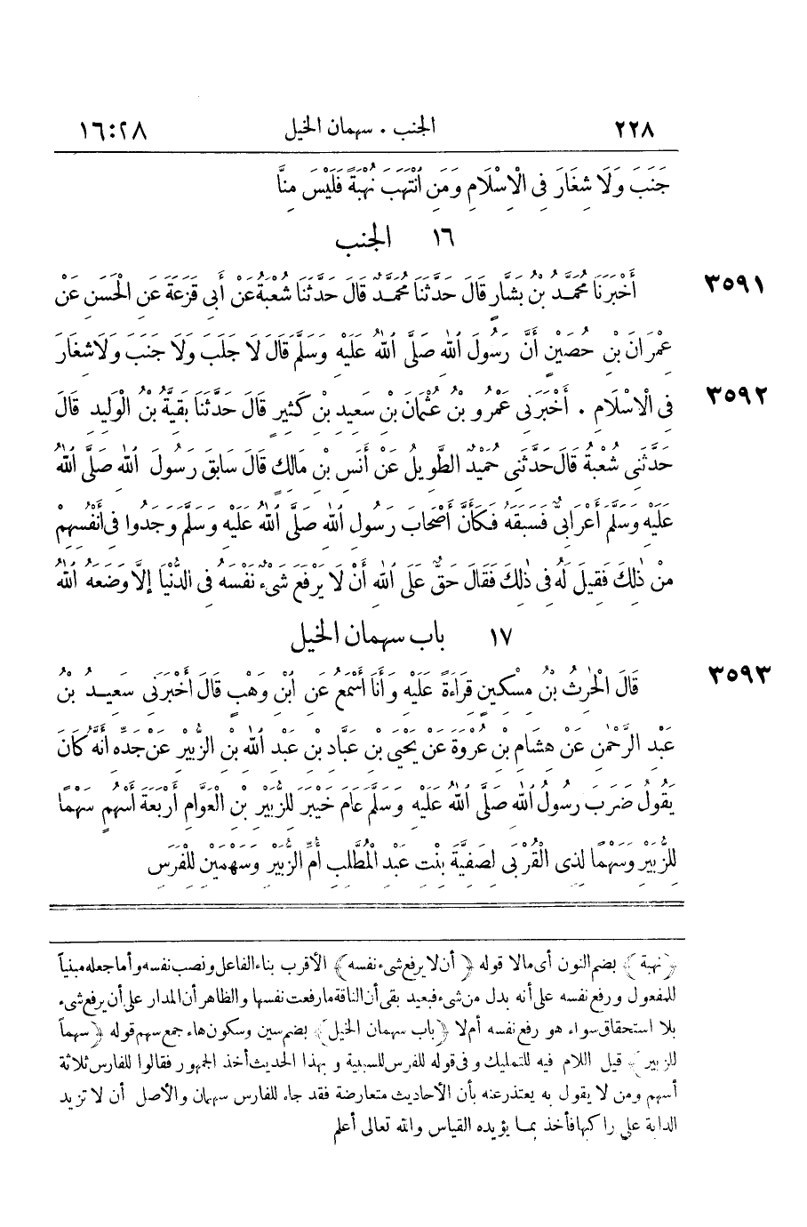 [3592] أَن لَا يرفع شَيْء نَفسه الْأَقْرَب بِنَاء الْفَاعِل وَنصب نَفسه وَأما جعله مَبْنِيا للْمَفْعُول وَرفع نَفسه على انه بدل من شَيْء فبعيد بَقِي أَن النَّاقة مَا رفعت نَفسهَا وَالظَّاهِر أَن الْمدَار على أَن يرفع شَيْء بِلَا اسْتِحْقَاق سَوَاء هُوَ رفع نَفسه أم لَا بَاب سَهْمَان الْخَيل بِضَم سين وَسُكُون هَاء جمع سهم
