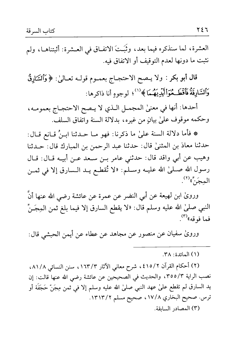 قال أبو بكر: ولا يصح الاحتجاج بعموم قوله تعالى:} والسارق والسارقة فاقطعوا أيديهما {؛ لوجوهٍ أنا ذاكرها: