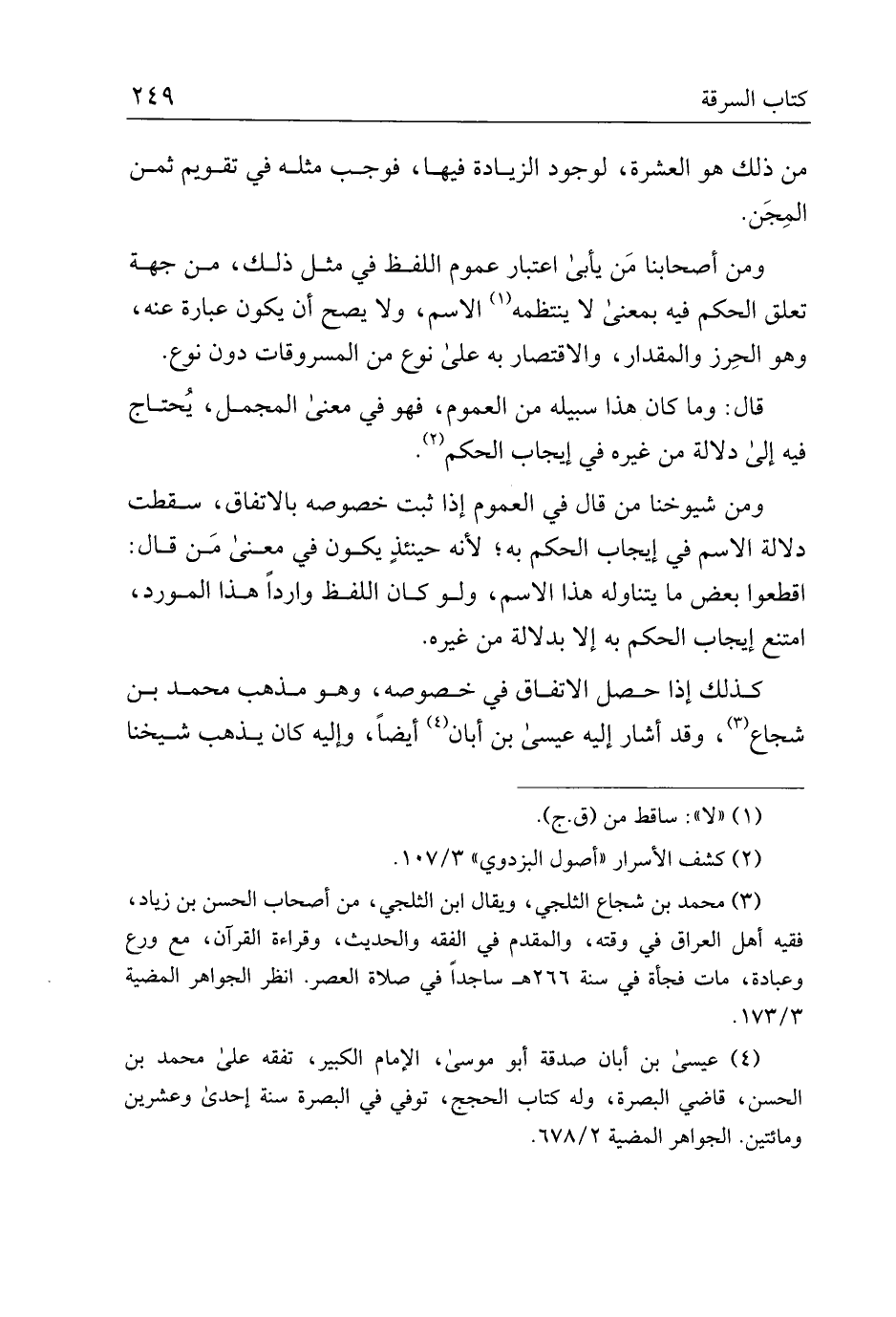 ومن أصحابنا من يأبي اعتبار عموم اللفظ في مثل ذلك، من جهة تعلق الحكم فيه بمعنى لا ينتظمه الاسم، ولا يصح أن يكون عبارة عنه، وهو الحرز والمقدار، والاقتصار به على نوع من المسروقات دون نوع.