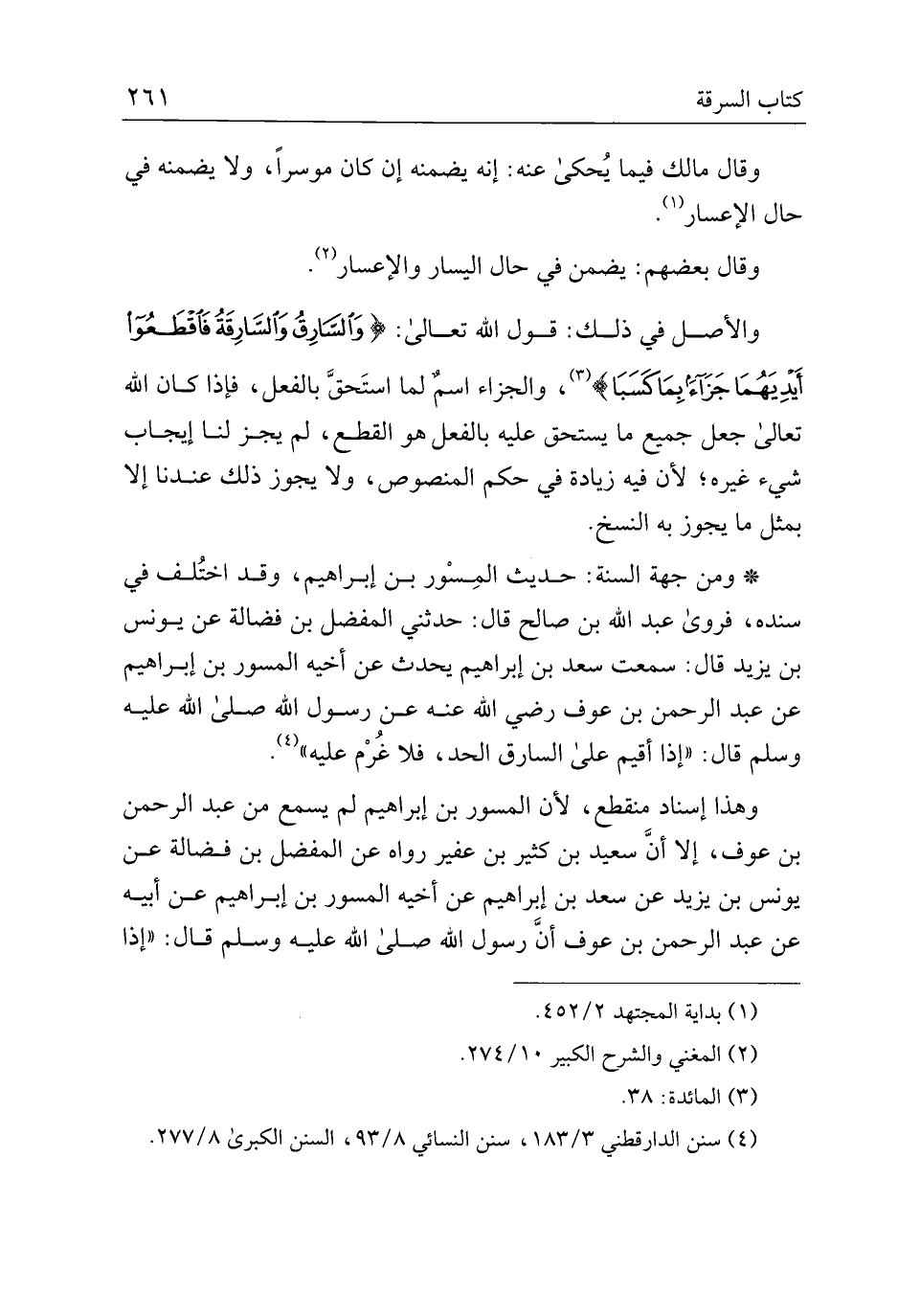 * ومن جهة السنة: حديث المسور بن إبراهيم، وقد اختلف في سنده، فروى عبد الله بن صالح قال: حدثني المفضل بن فضالة عن يونس بن يزيد قال: سمعت سعد بن إبراهيم يحدث عن أخيه المسور بن إبراهيم عن عبد الرحمن بن عوف رضي الله عنه عن رسول الله صلى الله عليه وسلم قال: "إذا أقيم على السارق الحد، فلا غرم عليه".