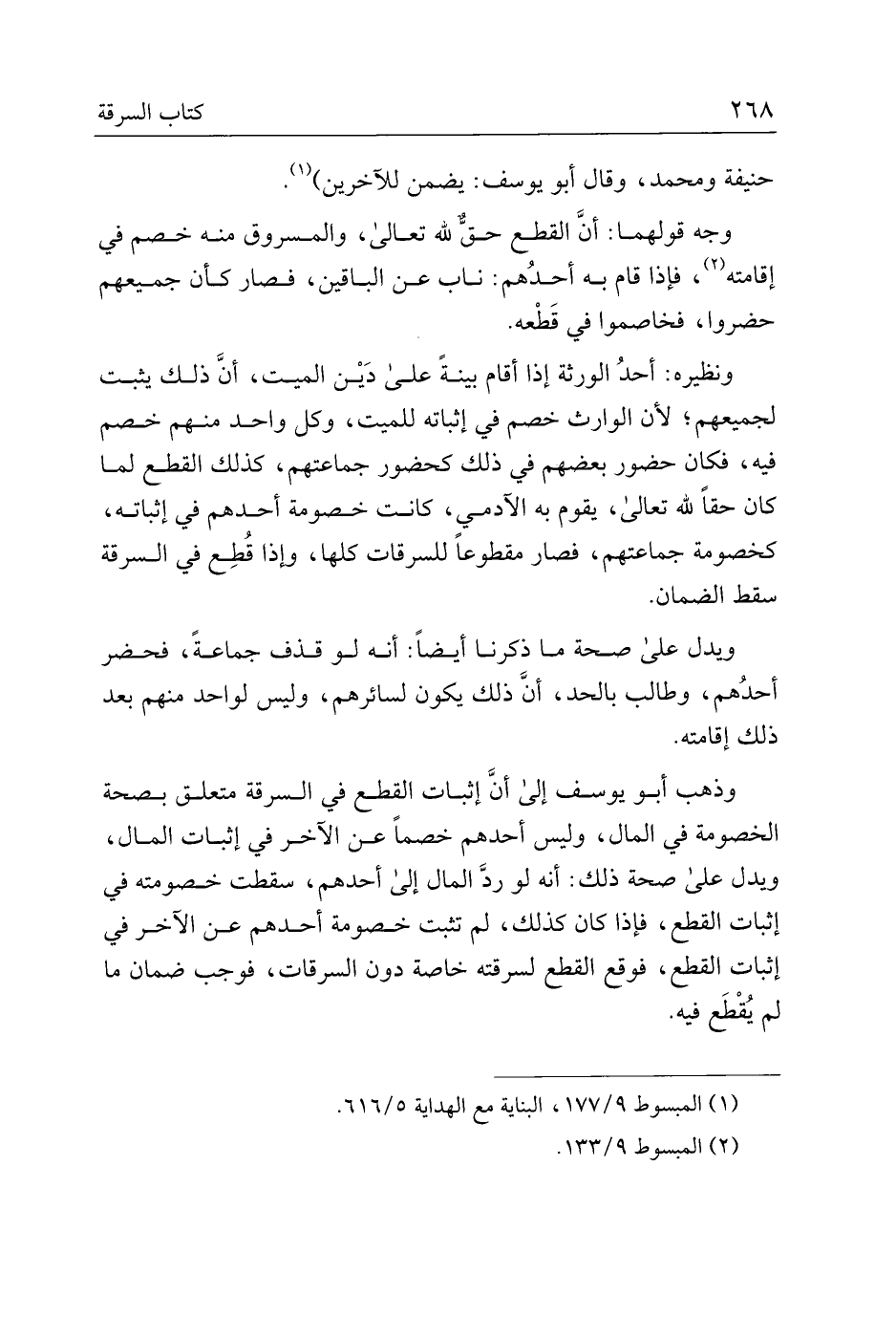 ونظيره: أحد الورثة إذا أقام بينه على دين الميت، أن ذلك يثبت لجميعهم؛ لأن الوارث خصم في إثباته للميت، وكل واحد منهم خصم فيه، فكان حضور بعضهم في ذلك كحضور جماعتهم، كذلك القطع لما كان حقًا لله تعالى، يقوم به الآدمي، كانت خصومة أحدهم في إثباته، كخصومة جماعتهم، فصار مقطوعًا للسرقات كلها، وإذا قطع في السرقة سقط الضمان.