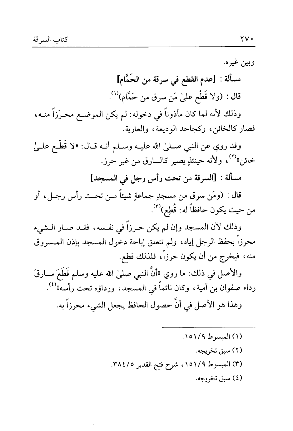 وذلك لأن المسجد وإن لم يكن حرزًا في نفسه، فقد صار الشيء محرزًا بحفظ الرجل إياه، ولم تتعلق إباحة دخول المسجد بإذن المسروق منه، فيخرج من أن يكون حرزًا، فلذلك قطع.