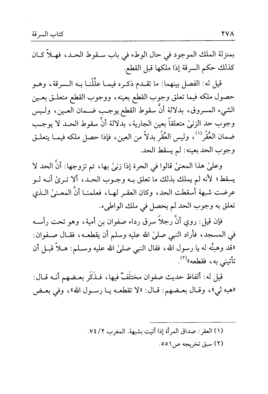 فإن قيل: روي أن رجلاً سرق رداء صفوان بن أمية، وهو تحت رأسه في المسجد، فأراد النبي صلى الله عليه وسلم أن يقطعه، فقال صفوان: "قد وهبته له يا رسول الله، فقال النبي صلى الله عليه وسلم: هلا قبل أن تأتيني به، فقطعه".