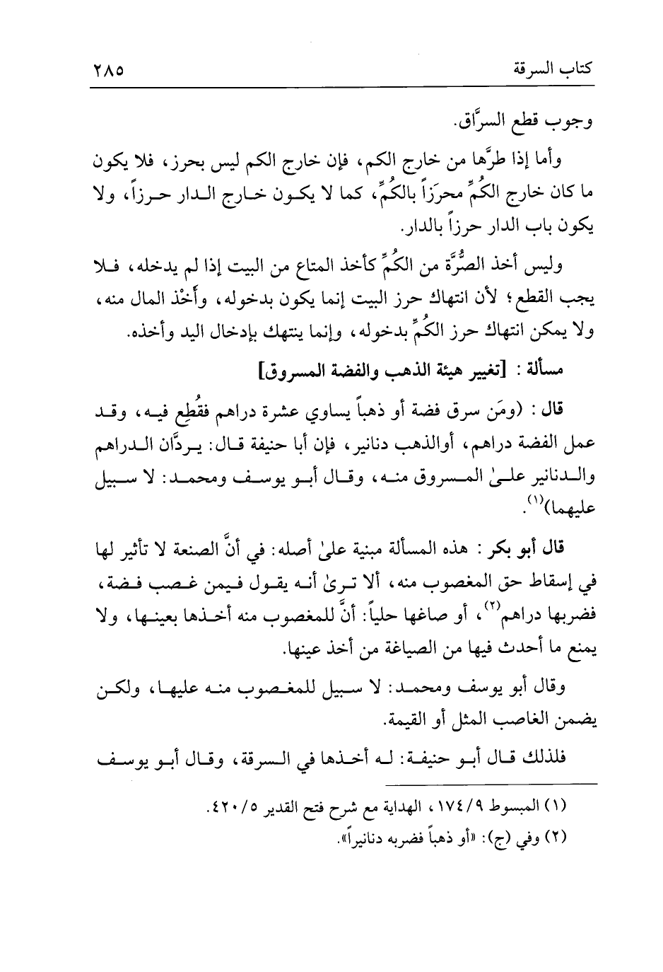 قال: (ومن سرق فضة أو ذهبًا يساوي عشرة دراهم فقطع فيه، وقد عمل الفضة دراهم، أو الذهب دنانير، فإن أبا حنيفة قال: يردان الدراهم والدنانير على المسروق منه، وقال أبو يوسف ومحمد: لا سبيل عليهما).