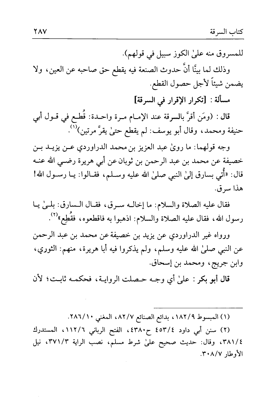 قال: (ومن أقر بالسرقة عند الإمام مرة واحدة: قطع في قول أبي حنيفة ومحمد، وقال أبو يوسف: لم يقطع حتى يقر مرتين).