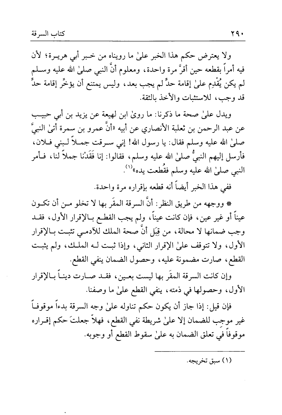وإن كانت السرقة المقر بها ليست بعين، فقد صارت دينًا بالإقرار الأول، وحصولها في ذمته، ينفي القطع على ما وصفنا.
