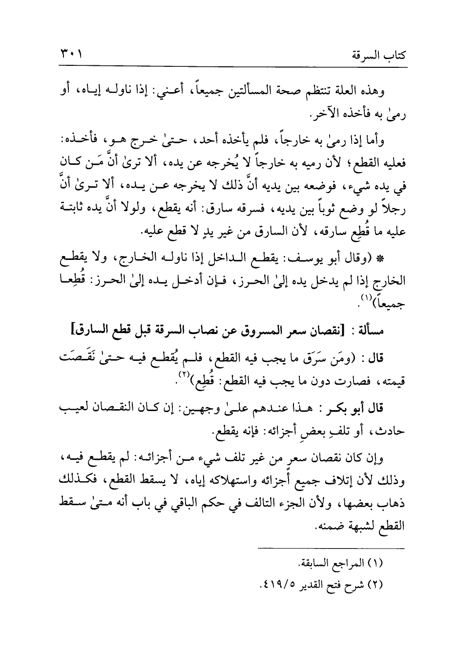 وإن كان نقصان سعر من غير تلف شيء من أجزائه: لم يقطع فيه، وذلك لأن إتلاف جميع أجزائه واستهلاكه إياه، لا يسقط القطع، فكذلك ذهاب بعضها، ولأن الجزء التالف في حكم الباقي في باب أنه متى سقط القطع لشبهة ضمنه.