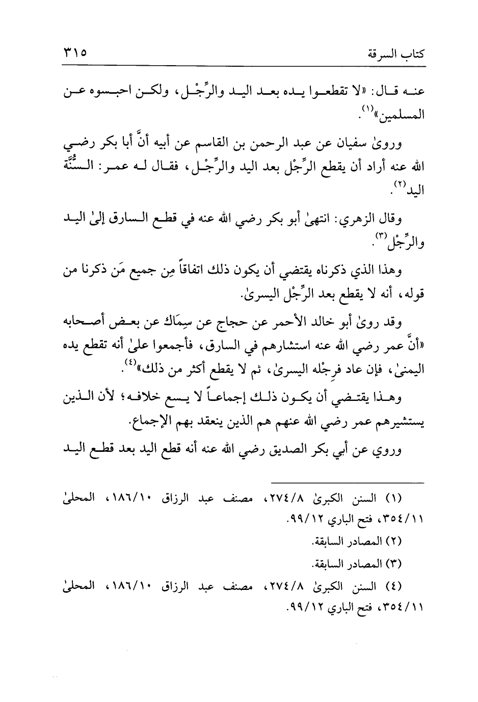 وروى سفيان عن عبد الرحمن بن القاسم عن أبيه أن أبا بكر رضي الله عنه أراد أن يقطع الرجل بعد اليد والرجل، فقال له عمر: السنة اليد.