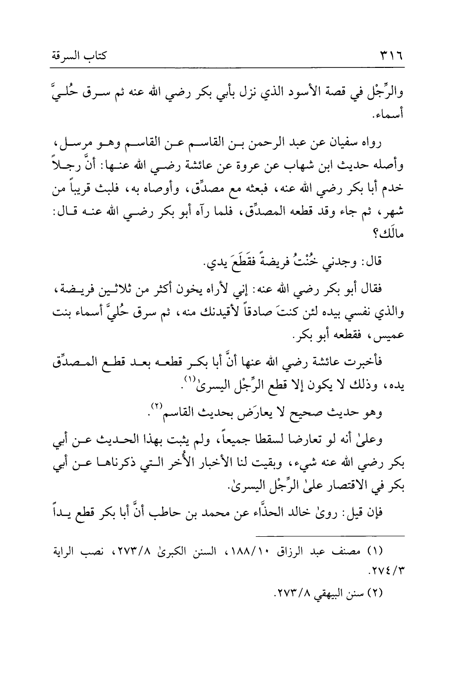 فأخبرت عائشة رضي الله عنها أن أبا بكر قطعه بعد قطع المصدق يده، وذلك لا يكون إلا قطع الرجل اليسرى.
