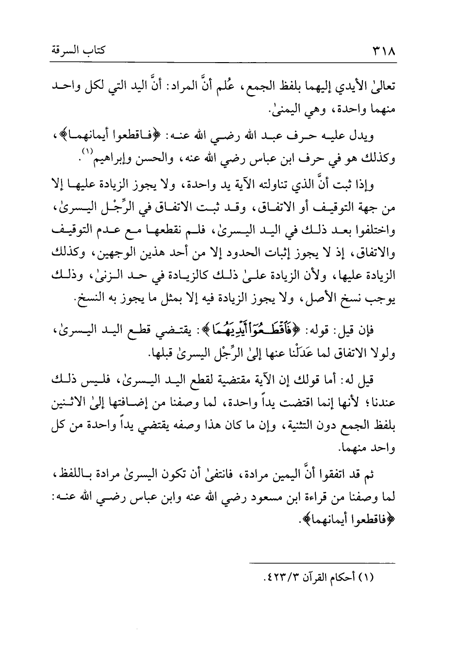 ثم قد اتفقوا أن اليمين مرادة، فانتفى أن تكون اليسرى مرادة باللفظ، لما وصفنا من قراءة ابن مسعود رضي الله عنه وابن عباس رضي الله عنه:} فاقطعوا أيمانهما {.