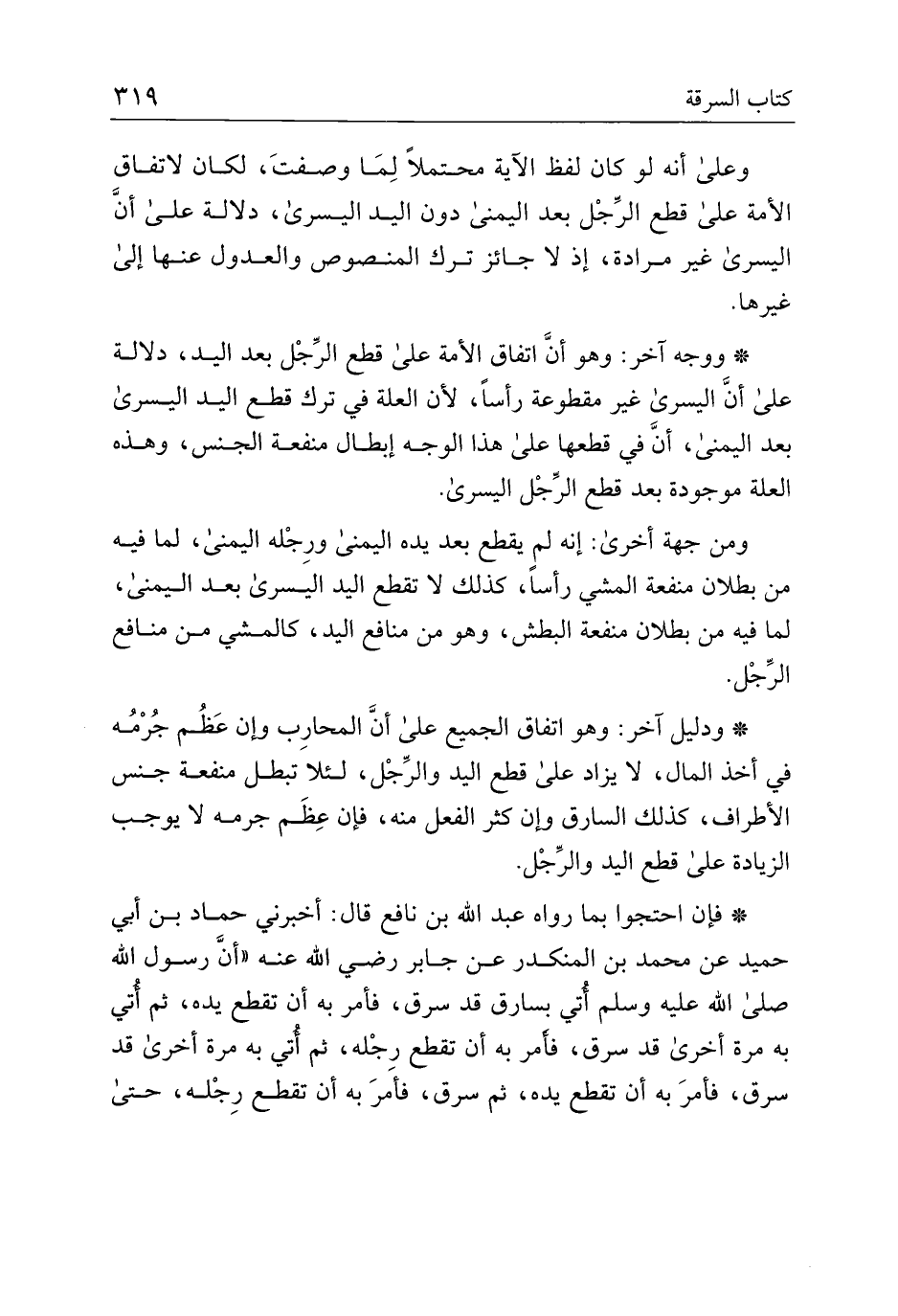 * ووجه آخر: وهو أن اتفاق الأمة على قطع الرجل بعد اليد، دلالة على أن اليسرى غير مقطوعة رأسًا، لأن العلة في ترك قطع اليد اليسرى بعد اليمنى، أن في قطعها على هذا الوجه إبطال منفعة الجنس، وهذه العلة موجودة بعد قطع الرجل اليسرى.