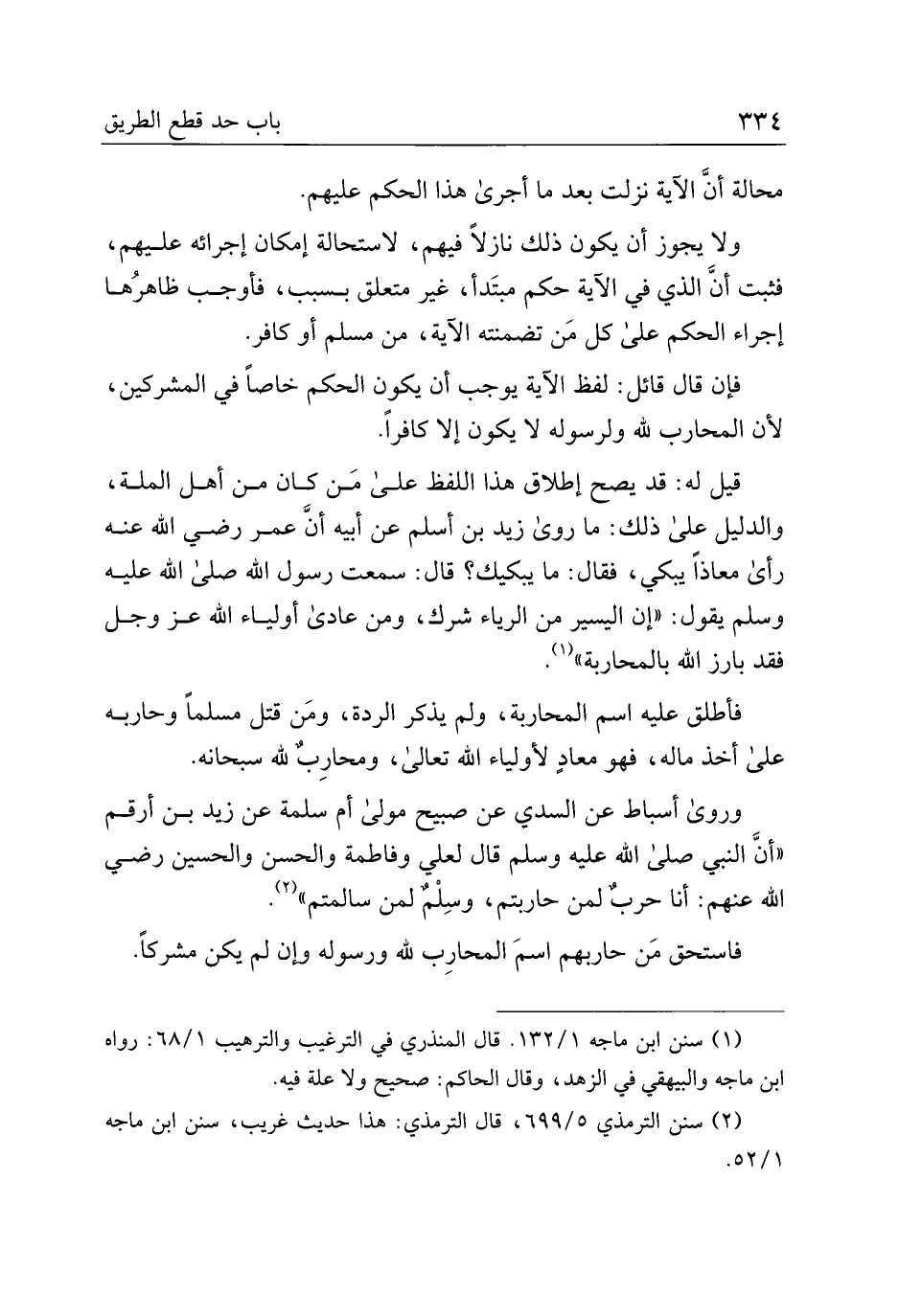 فأطلق عليه اسم المحاربة، ولم يذكر الردة، ومن قتل مسلمًا وحاربه على أخذ ماله، فهو معادٍ لأولياء الله تعالى، ومحارب لله سبحانه.