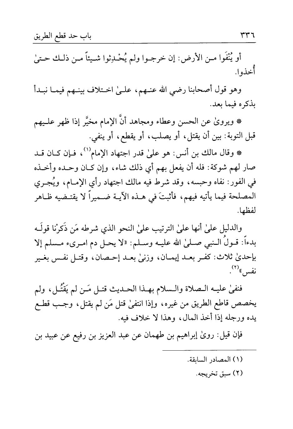 * وقال مالك بن أنس: هو على قدر اجتهاد الإمام، فإن كان قد صار لهم شوكة: فله أن يفعل بهم أي ذلك شاء، وإن كان وحده وأخذه في الفور: نفاه وحبسه، وقد شرط فيه مالك اجتهاد رأي الإمام، ويجري المصلحة فيما يأتيه فيهم، فأثبت في هذه الآية ضميرًا لا يقتضيه ظاهر لفظها.