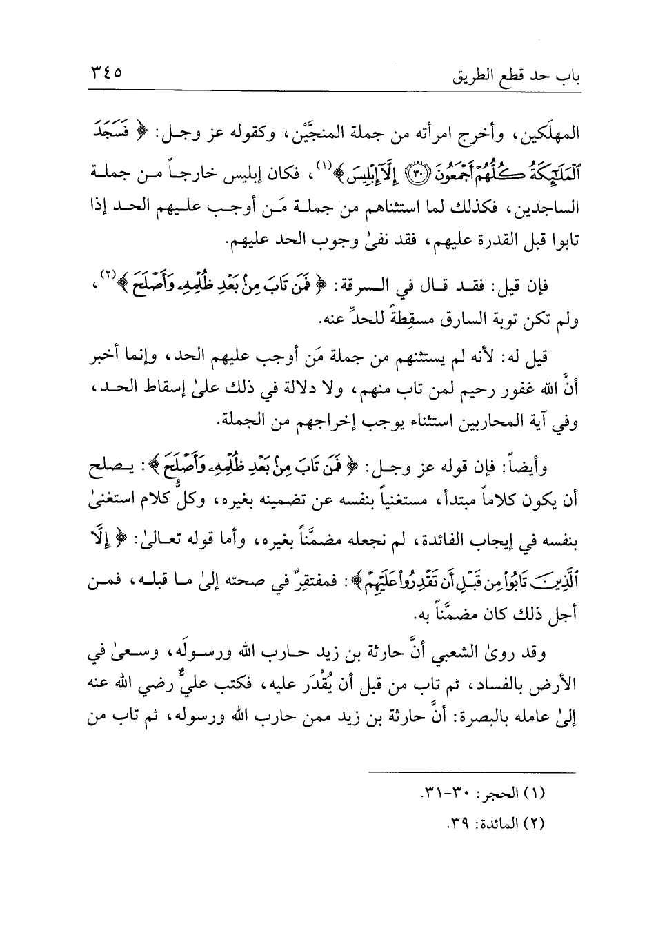 المهلكين، وأخرج امرأته من جملة المنجين، وكقوله عز وجل:} فسجد الملائكة كلهم أجمعون إلا إبليس {، فكان إبليس خارجًا من جملة الساجدين، فكذلك لما استثناهم من جملة من أوجب عليهم الحد إذا تابوا قبل القدرة عليهم، فقد نفى وجوب الحد عليهم.