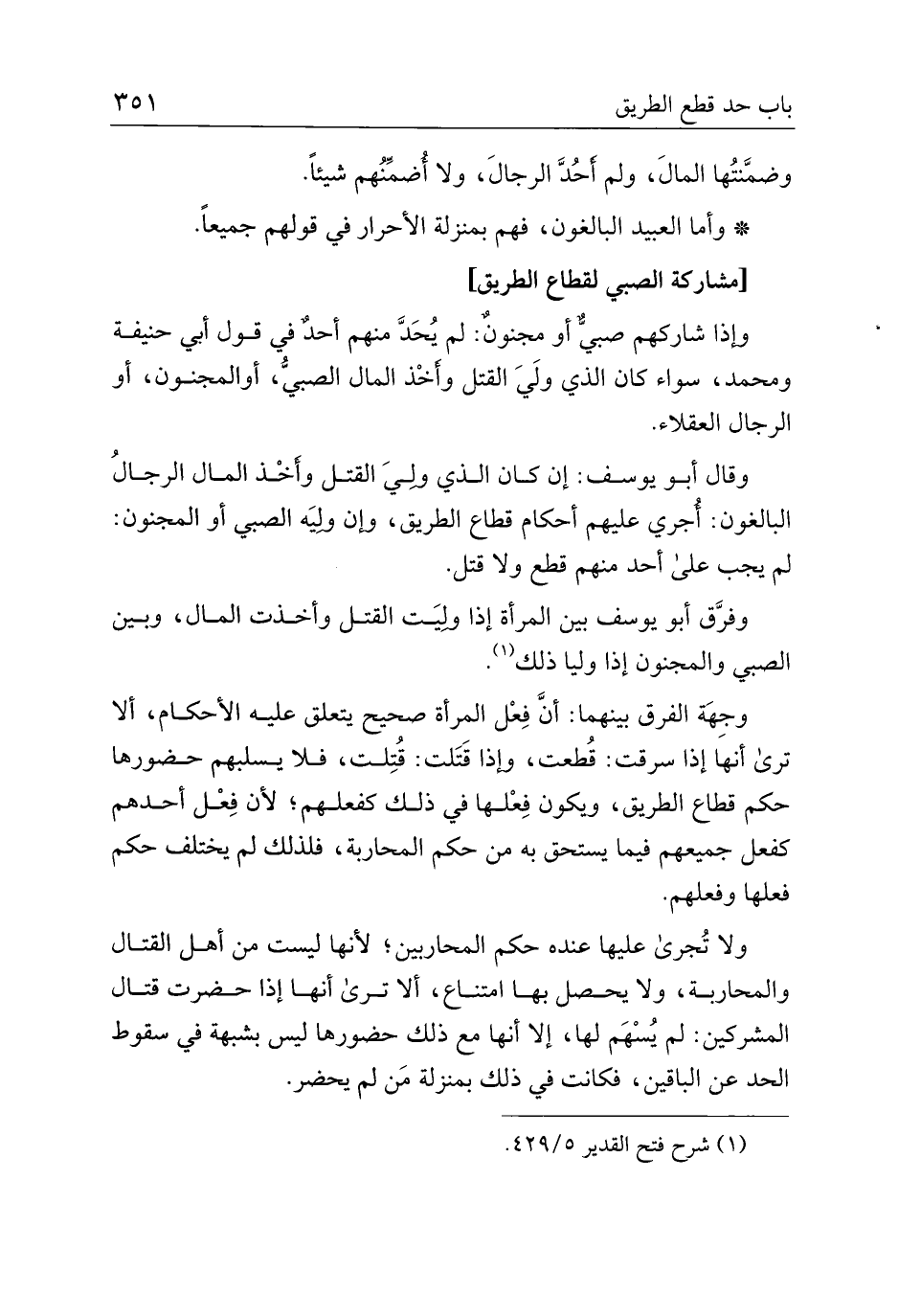 وإذا شاركهم صبي أو مجنون: لم يحد منهم أحد في قول أبي حنيفة ومحمد، سواء كان الذي ولي القتل وأخذ المال الصبي، أو المجنون، أو الرجال العقلاء.
