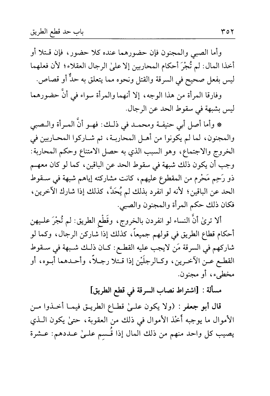 ألا ترى أن النساء لو انفردن بالخروج، وقطع الطريق: لم تجر عليهن أحكام قطاع الطريق في قولهم جميعًا، كذلك إذا شاركن الرجال، وكما لو شاركهم في السرقة من لا يجب عليه القطع: كان ذلك شبهة في سقوط القطع عن الآخرين، وكالرجلين إذا قتلا رجلاً، وأحدهما أبوه، أو مخطئ، أو مجنون.