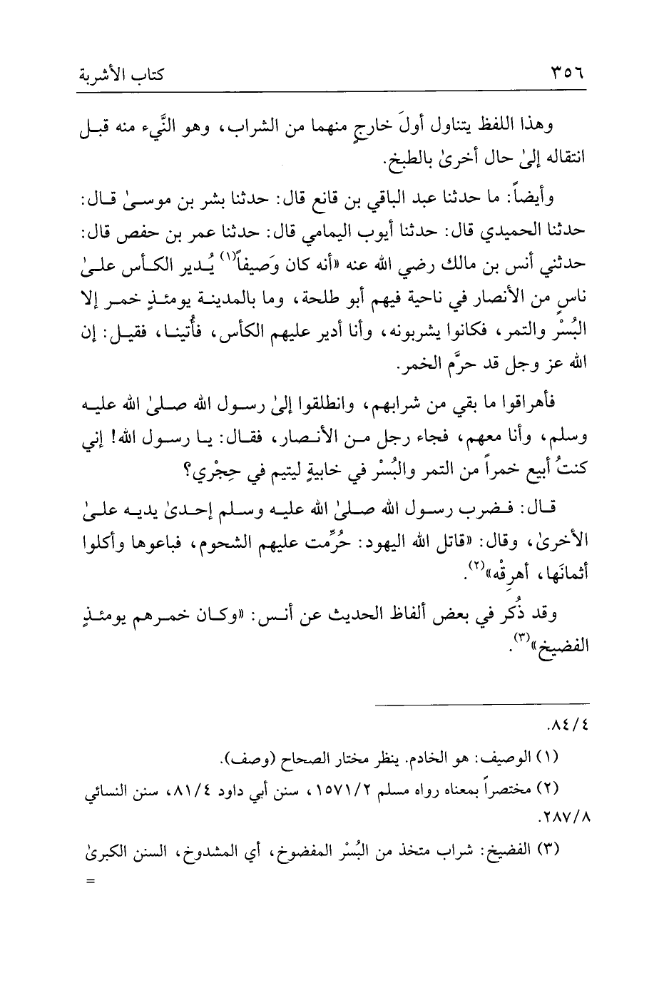 وأيضًا: ما حدثنا عبد الباقي بن قانع قال: حدثنا بشر بن موسى قال: حدثنا الحميدي قال: حدثنا أيوب اليمامي قال: حدثنا عمر بن حفص قال: حدثني أنس بن مالك رضي الله عنه "أنه كان وصيفًا يدير الكأس على ناسٍ من الأنصار في ناحية فيهم أبو طلحة، وما بالمدينة يومئذٍ خمر إلا البسر والتمر، فكانوا يشربونه، وأنا أدير عليهم الكأس، فأتينا، فقيل: إن الله عز وجل قد حرم الخمر.
