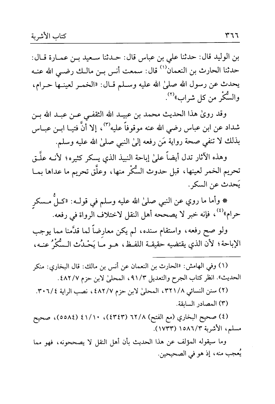 بن الوليد قال: حدثنا علي بن عباس قال: حدثنا سعيد بن عمارة قال: حدثنا الحارث بن النعمان قال: سمعت أنس بن مالك رضي الله عنه يحدث عن رسول الله صلى الله عليه وسلم قال: "الخمر لعينها حرام، والسكر من كل شراب".