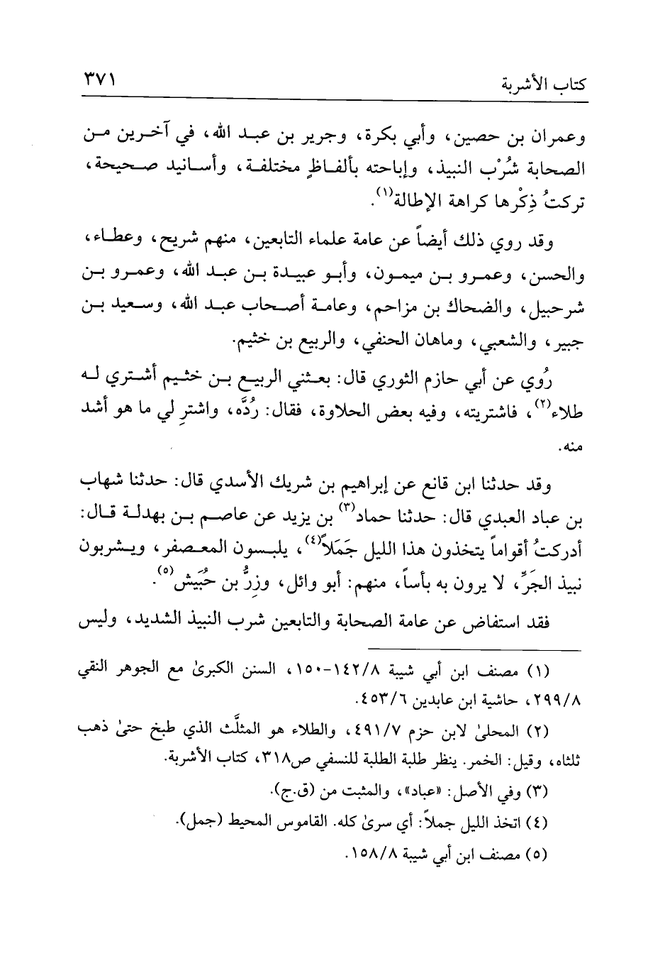 وعمران بن حصين، وأبي بكرة، وجرير بن عبد الله، في آخرين من الصحابة شرب النبيذ، وإباحته بألفاظٍ مختلفة، وأسانيد صحيحة، تركت ذكرها كراهة الإطالة.
