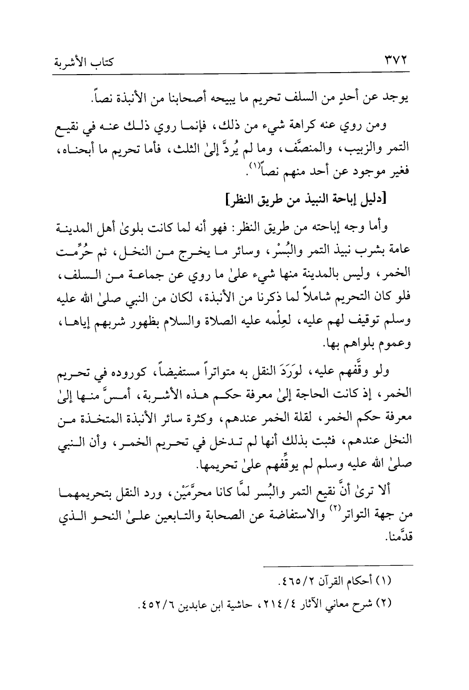 ألا ترى أن نقيع التمر والبسر لما كانا محرمين، ورد النقل بتحريمهما من جهة التواتر والاستفاضة عن الصحابة والتابعين على النحو الذي قدمنا.