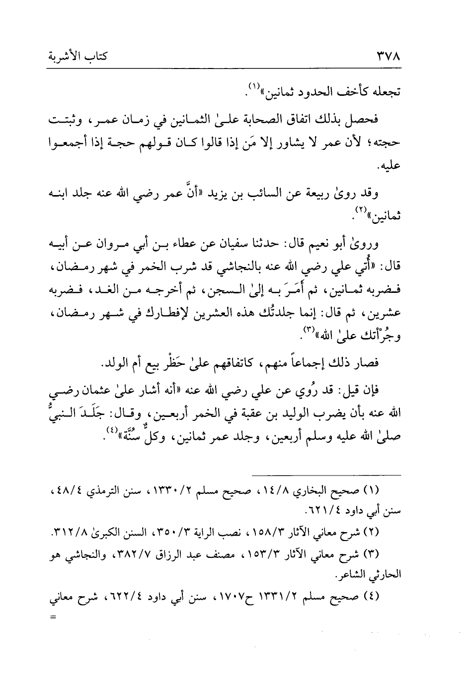 وقد روى ربيعة عن السائب بن يزيد "أن عمر رضي الله عنه جلد ابنه ثمانين".