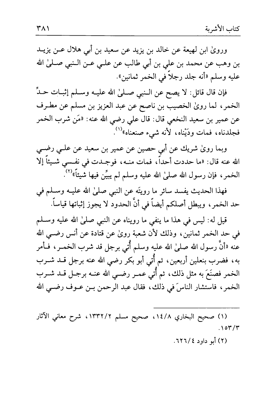 فهذا الحديث يفسد سائر ما رويته عن النبي صلى الله عليه وسلم في حد الخمر، ويبطل أصلكم أيضًا في أن الحدود لا يجوز إثباتها قياسًا.