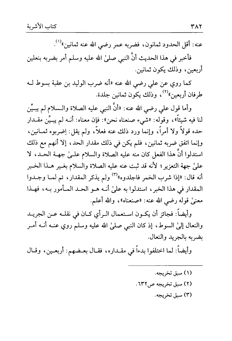 وأما قول علي رضي الله عنه: "أن النبي عليه الصلاة والسلام لم يبين لنا فيه شيئًا"، وقوله: "شيء صنعناه نحن": فإن معناه: أنه لم يبين مقدار حده قولاً ولا أمرًا، وإنما ورد ذلك عنه فعلاً، ولم يقل: اضربوه ثمانين، وإنما اتفق ضربه ثمانين، فلم يكن في ذلك مقدار الحد، إلا أنهم مع ذلك استدلوا أن هذا الفعل كان منه عليه الصلاة والسلام على جهة الحد، لا على جهة التعزير؛ لأنه قد ثبت عنه عليه الصلاة والسلام بغير هذا الخبر أنه قال: "إذا شرب الخمر فاجلدوه" ولم يذكر المقدار، ثم لما وجدوا المقدار في هذا الخبر، استدلوا به على أنه هو الحد المأمور به، فهذا معنى قوله رضي الله عنه: "صنعناه"، والله أعلم.
