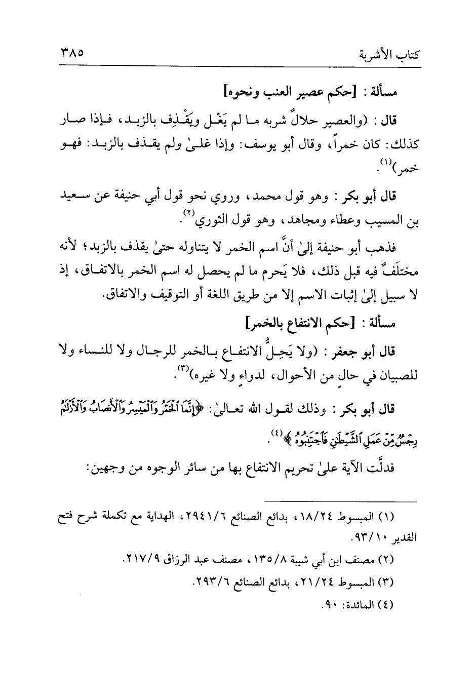 قال: (والعصير حلال شربه ما لم يغل ويقذف بالزبد، فإذا صار كذلك: كان خمرًا، وقال أبو يوسف: وإذا على ولم يقذف بالزبد: فهو خمر).