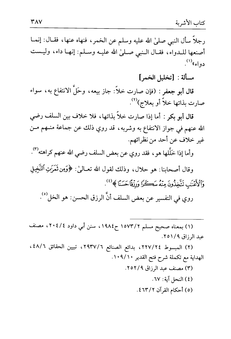 قال أبو بكر: أما إذا صارت خلاً بذاتها، فلا خلاف بين السلف رضي الله عنهم في جواز الانتفاع به وشربه، قد روي ذلك عن جماعة منهم من غير خلاف عن أحد من نظرائهم.