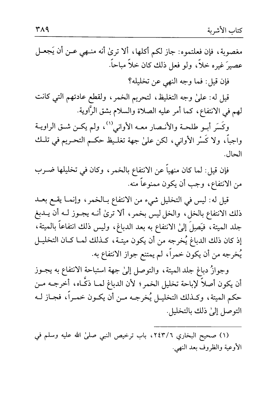 فإن قيل: لما كان منهيًا عن الانتفاع بالخمر، وكان في تخليلها ضرب من الانتفاع، وجب أن يكون ممنوعًا منه.
