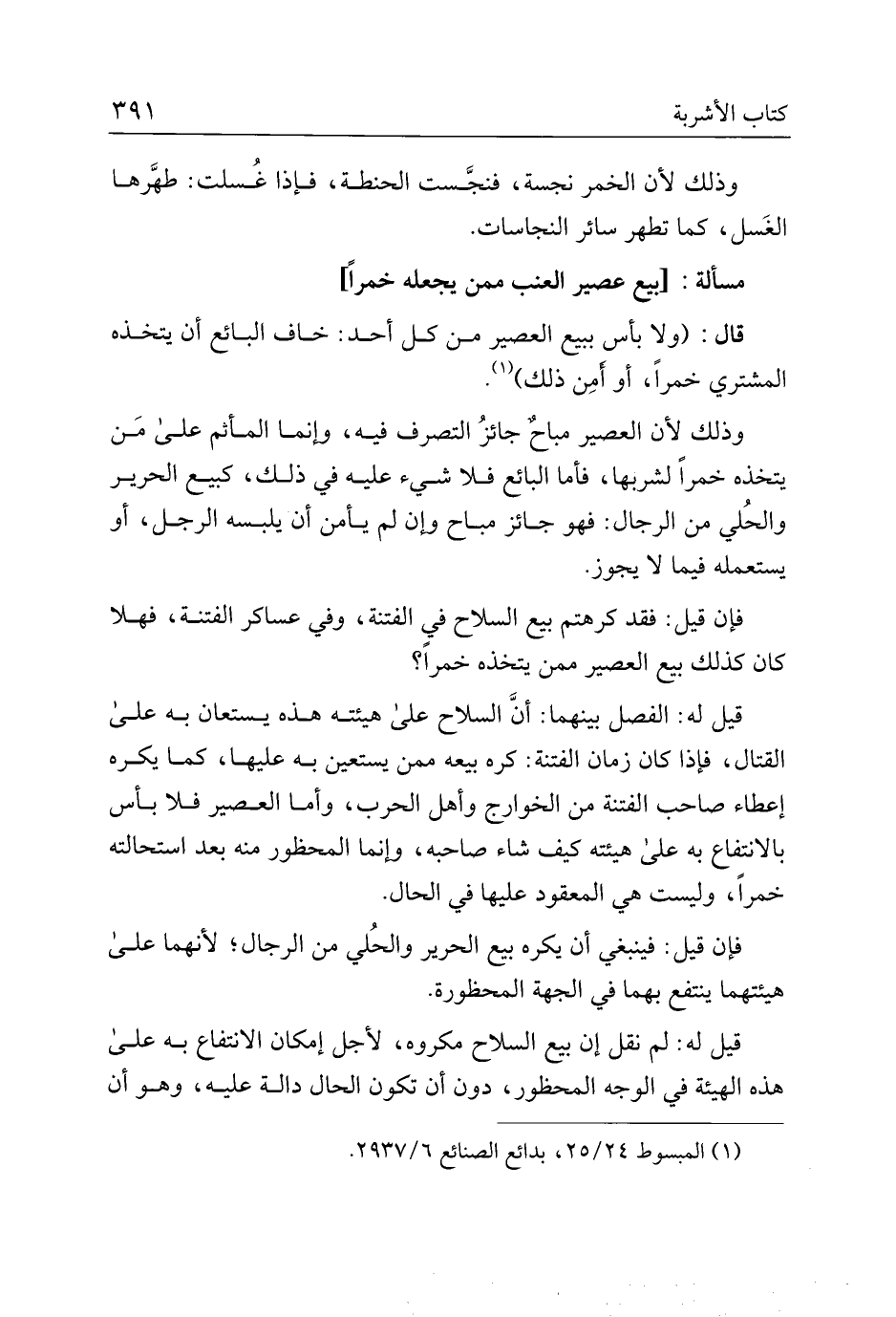 وذلك لأن العصير مباح جائز التصرف فيه، وإنما المأثم على من يتخذه خمرًا لشربها، فأما البائع فلا شيء عليه في ذلك، كبيع الحرير والحلي من الرجال: فهو جائز مباح وإن لم يأمن أن يلبسه الرجل، أو يستعمله فيما لا يجوز.